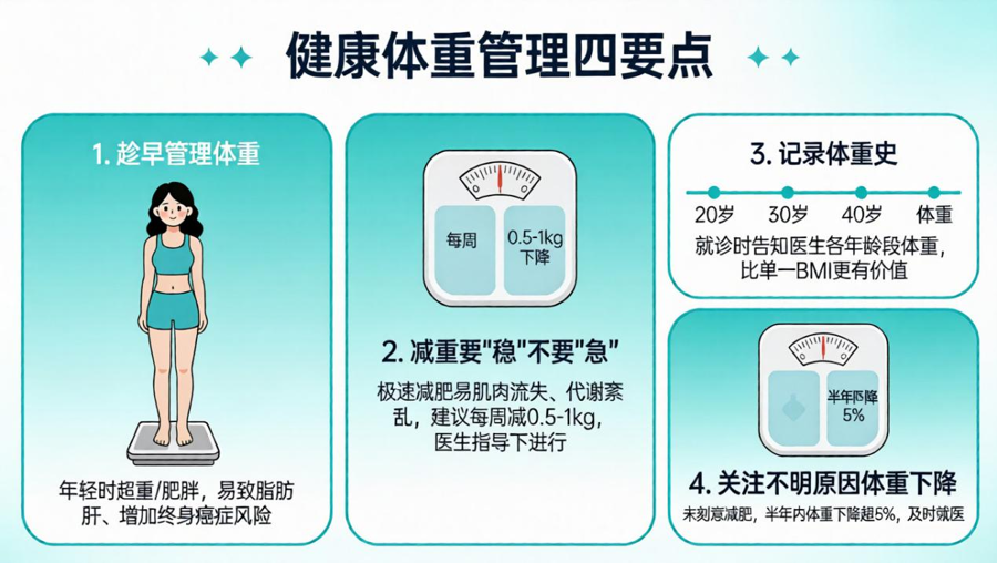 记录体重史,就诊时最好能告诉医生你20岁、30岁、40岁……时的体重,这比单一BMI值更有价值。